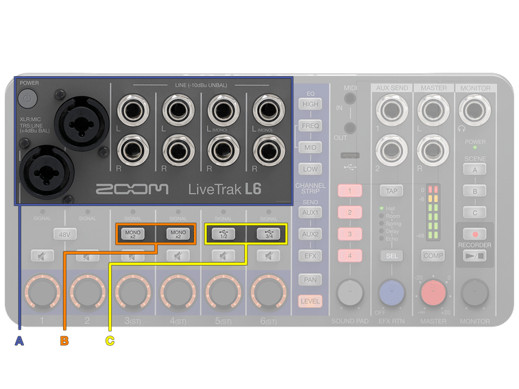Não se deixe enganar pelo tamanho. O L6 foi projetado com capacidades de mixer de grande porte: Cada faixa possui uma channel strip completa, incluindo envios auxiliares (aux sends), pan, efeitos e um EQ de 3 bandas com controle de médios ajustável.