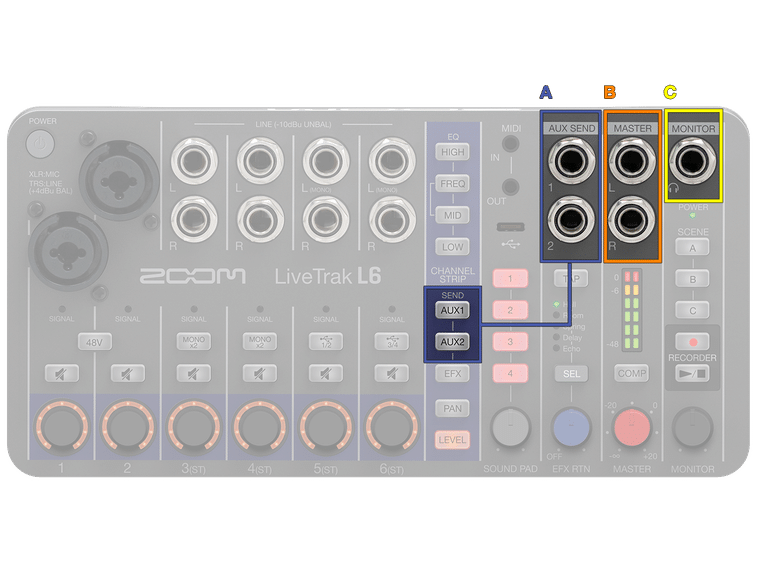 A. AUX OUTPUTS: Envie mixagens personalizadas para monitores, efeitos ou dispositivos externos.
